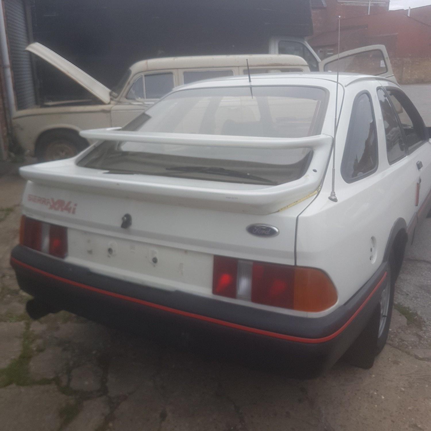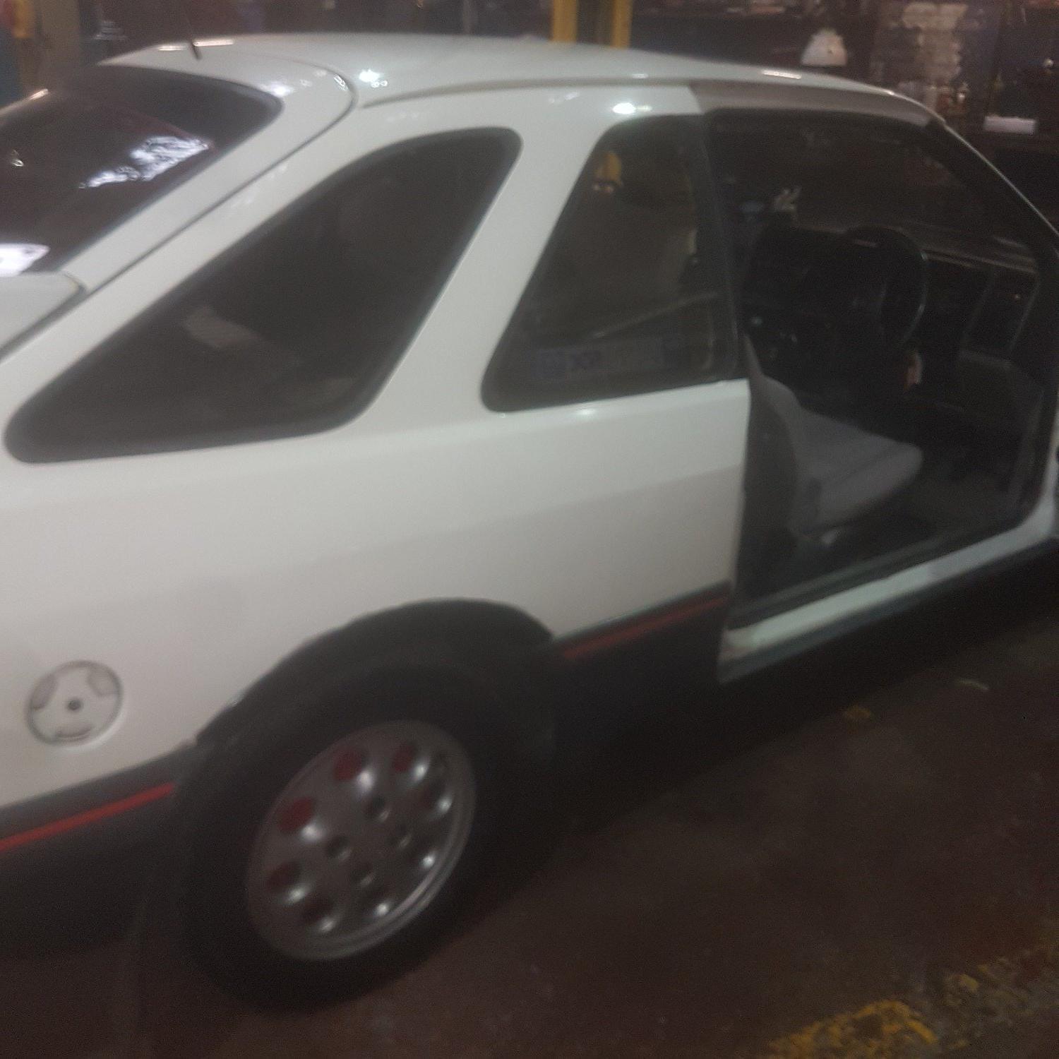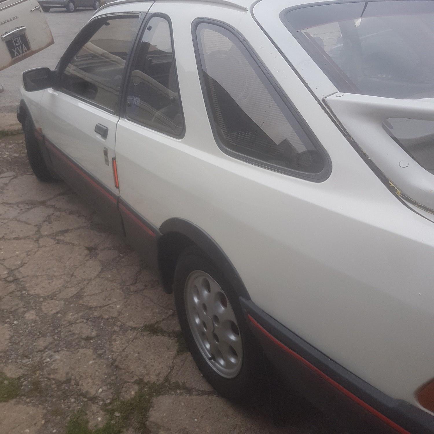 1983/4 XR4i presented in white and only 130000 miles from new. A good looking car in the colour needing some remedial works to the body and obviously well looked after, a substantial history file including MOT certs from 1988 and rebuilt engine at 66000. Superb un-molested interior, other than cracks to the dash top. The car is fitted with PAS, Central Locking, Electric windows and Sunroof.