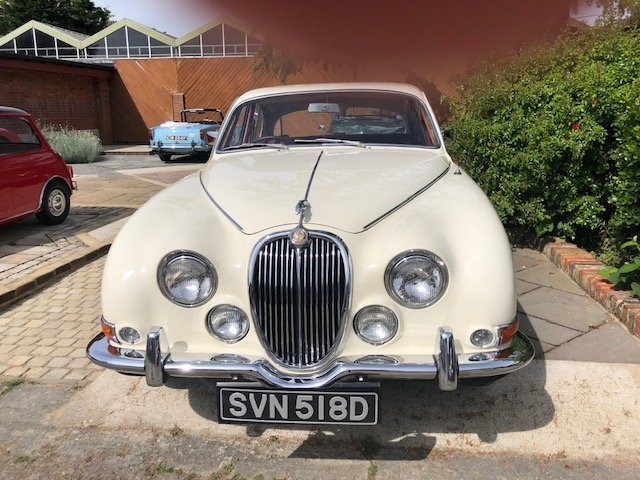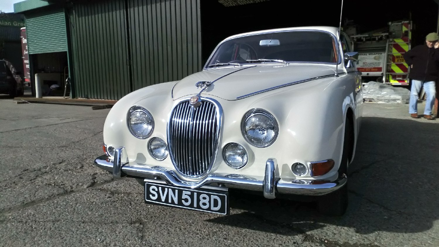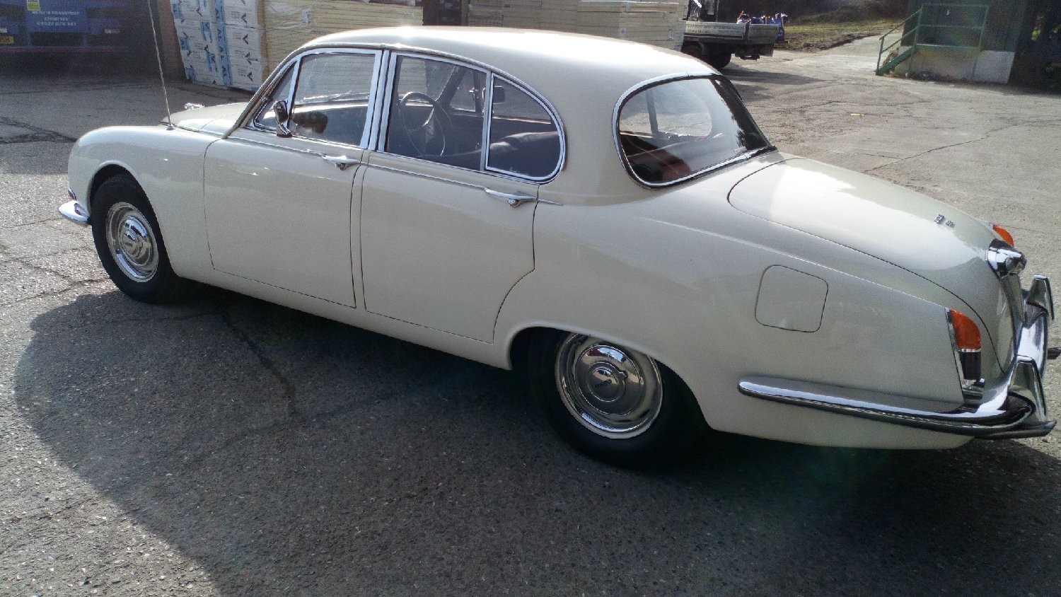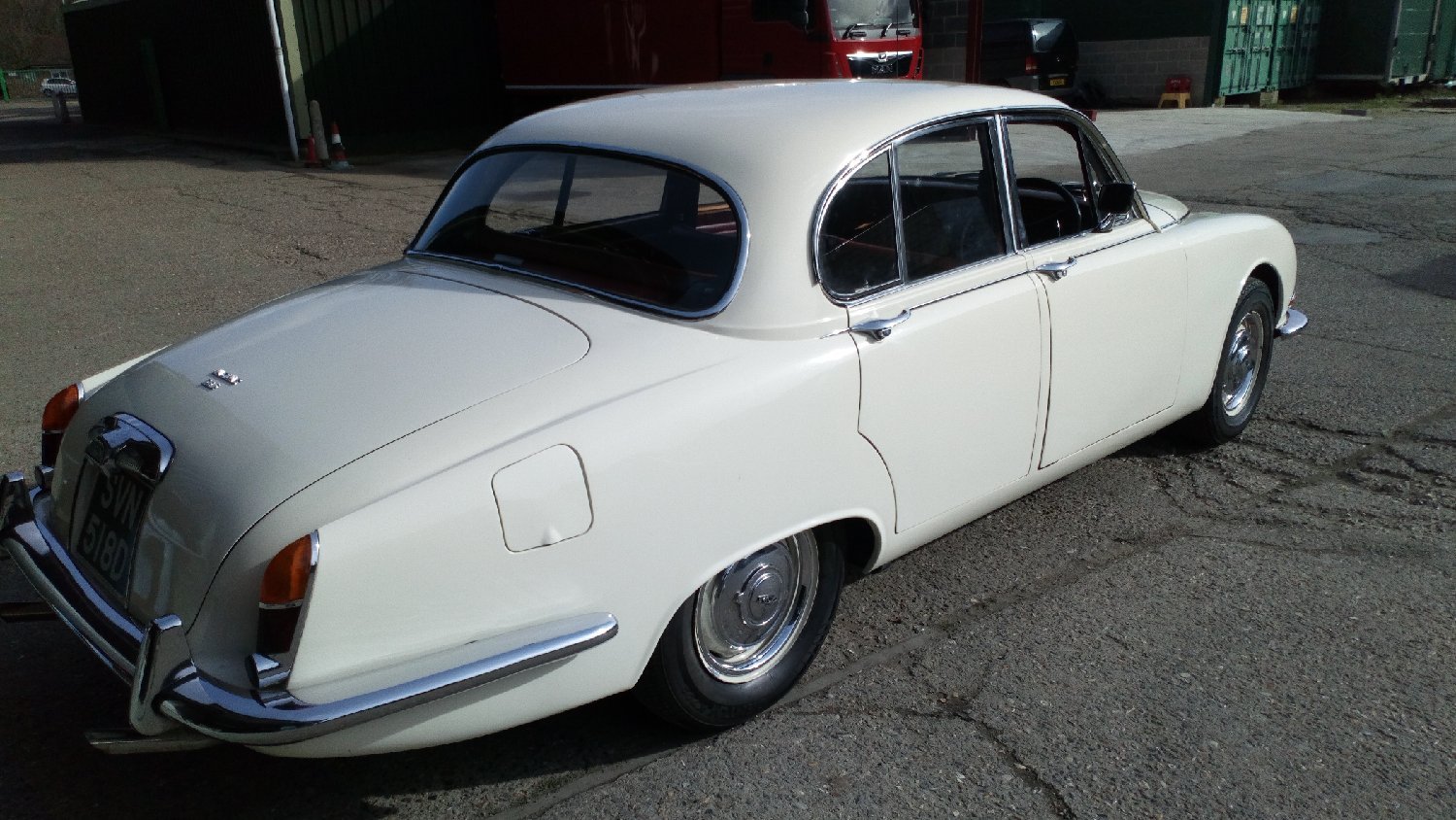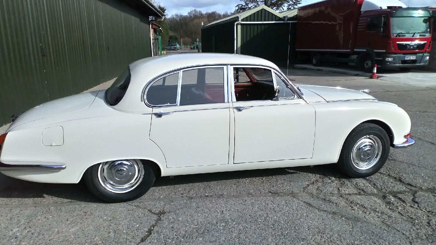 1966 Jaguar S-Type 3.8 automatic in Old English White with sumptuous red leather interior and walnut dashboard. Its original steel / chrome wheels have been retained providing a fully authentic period look.