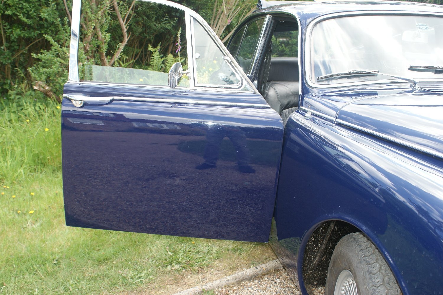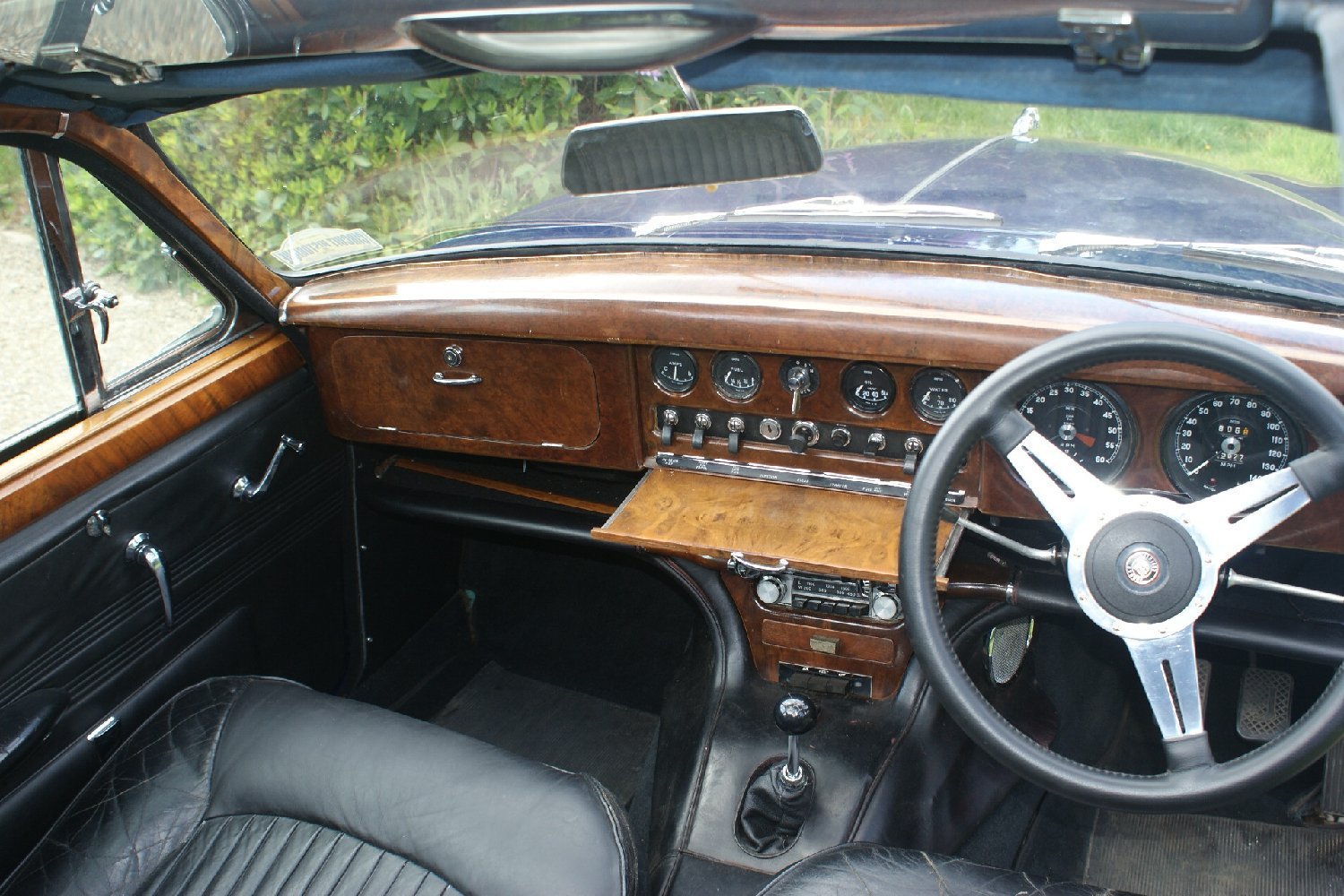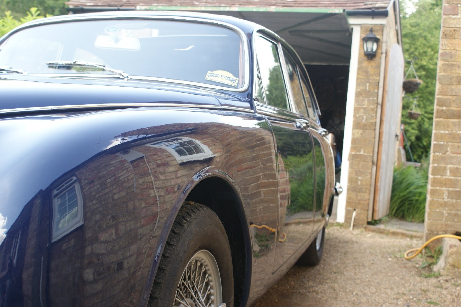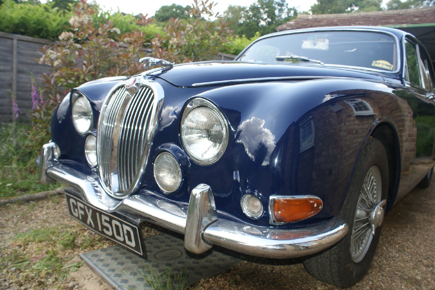 1966 Jaguar S-Type 3.8 manual in rich dark blue with a sumptuous leather interior and period walnut dashboard. This car boasts a full length sun-roof in full working order and properly seals from the elements when closed!