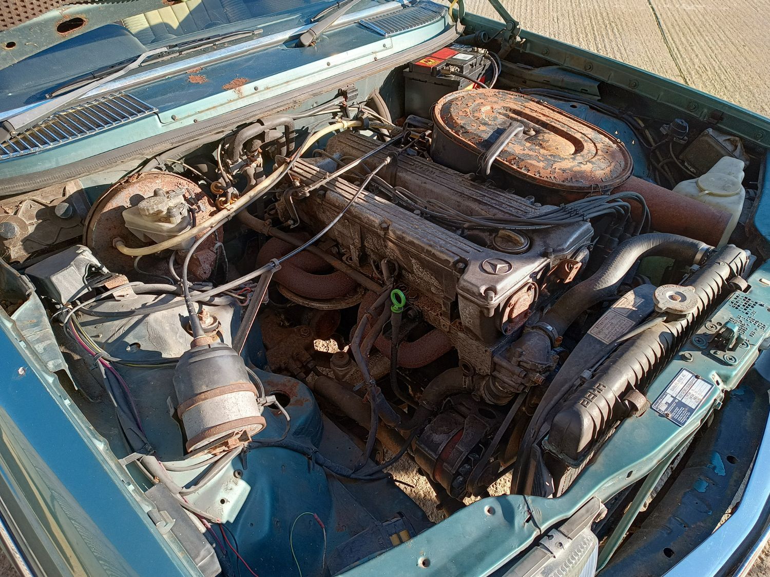 This delightful unmolested example comes to us with 63,000 miles on the clock. It’s remarkably sound for a 43 year old car: with the exception of some corrosion to the front lower valance it’s solid all over. The metallic turquoise paintwork (strangely called ‘Petrol’ by the Mercedes marketing boffins) is a little dull in places and suffers from a couple of small scabs but it would polish and touch-up nicely. Brown velour and veneer dominates the cabin. It’s all in good condition with just a patch on the side of the driver’s seat in need of attention.