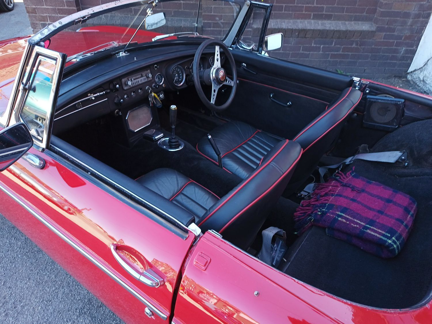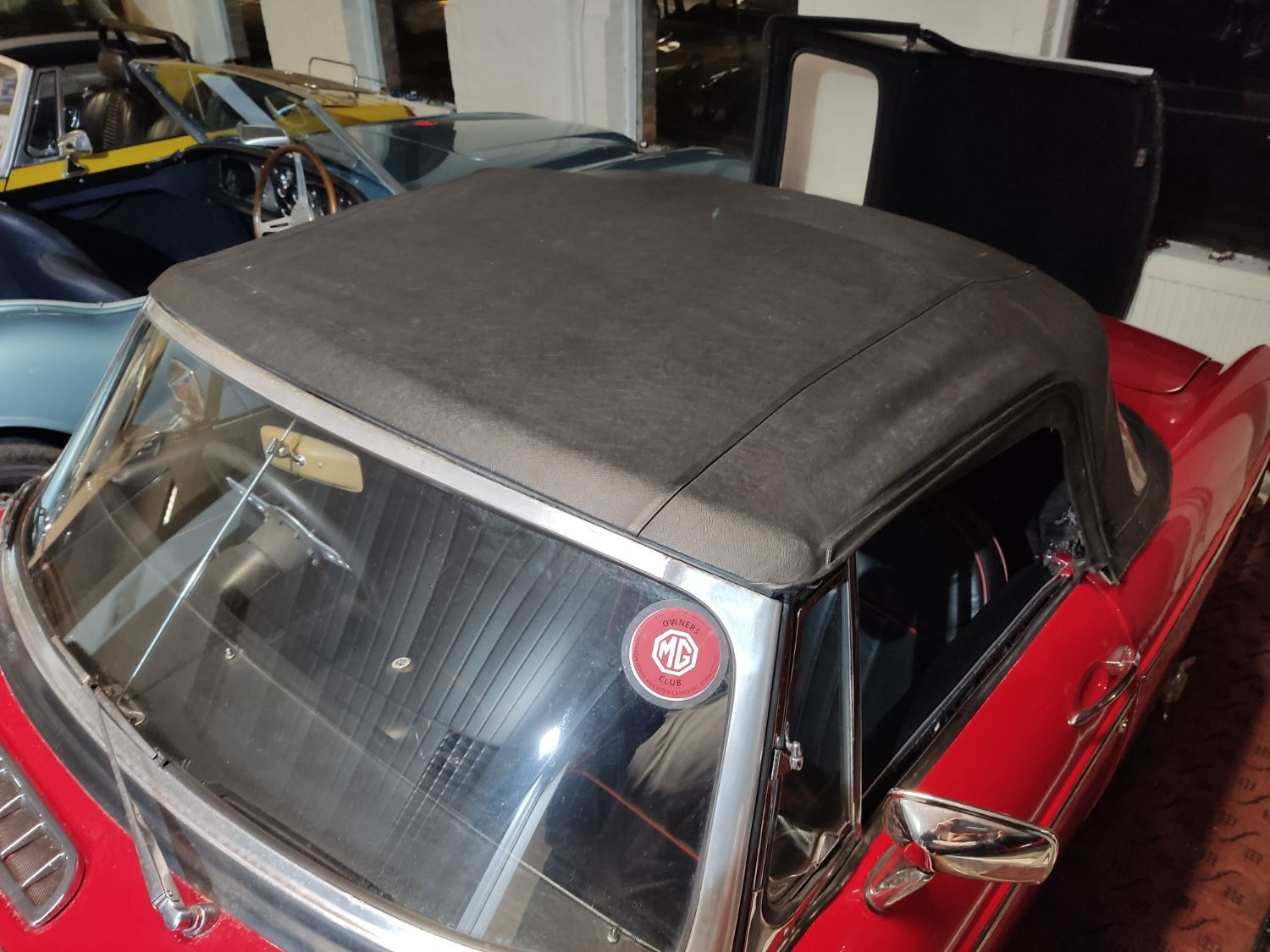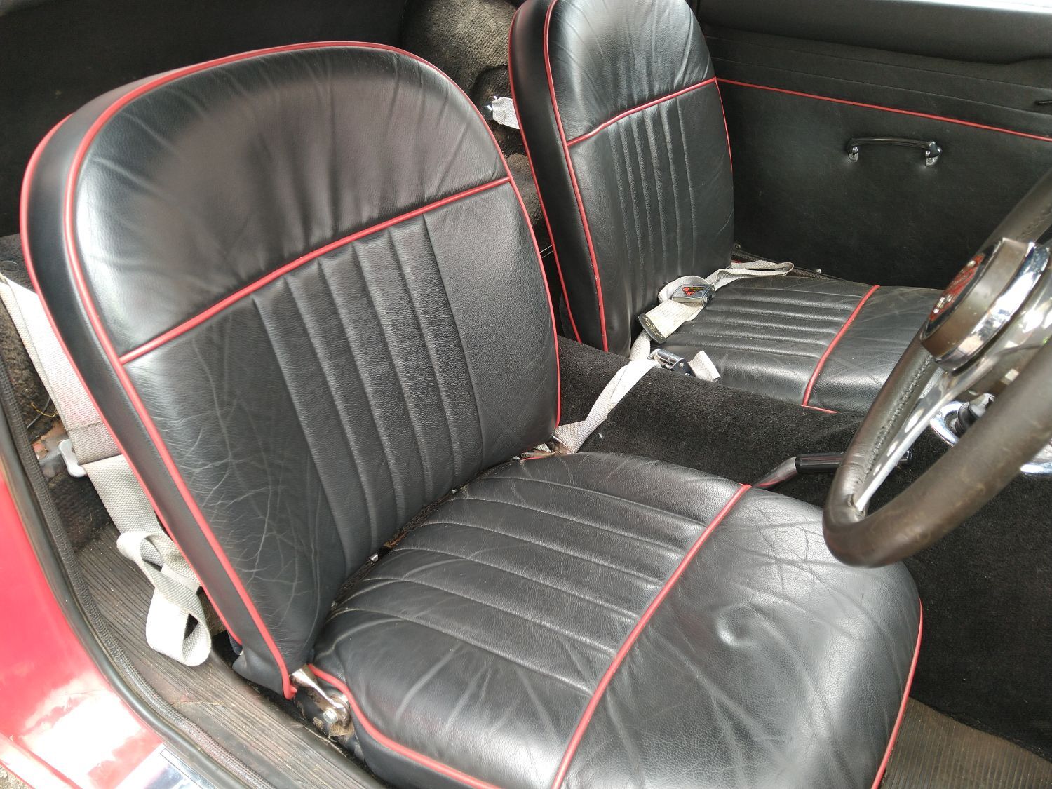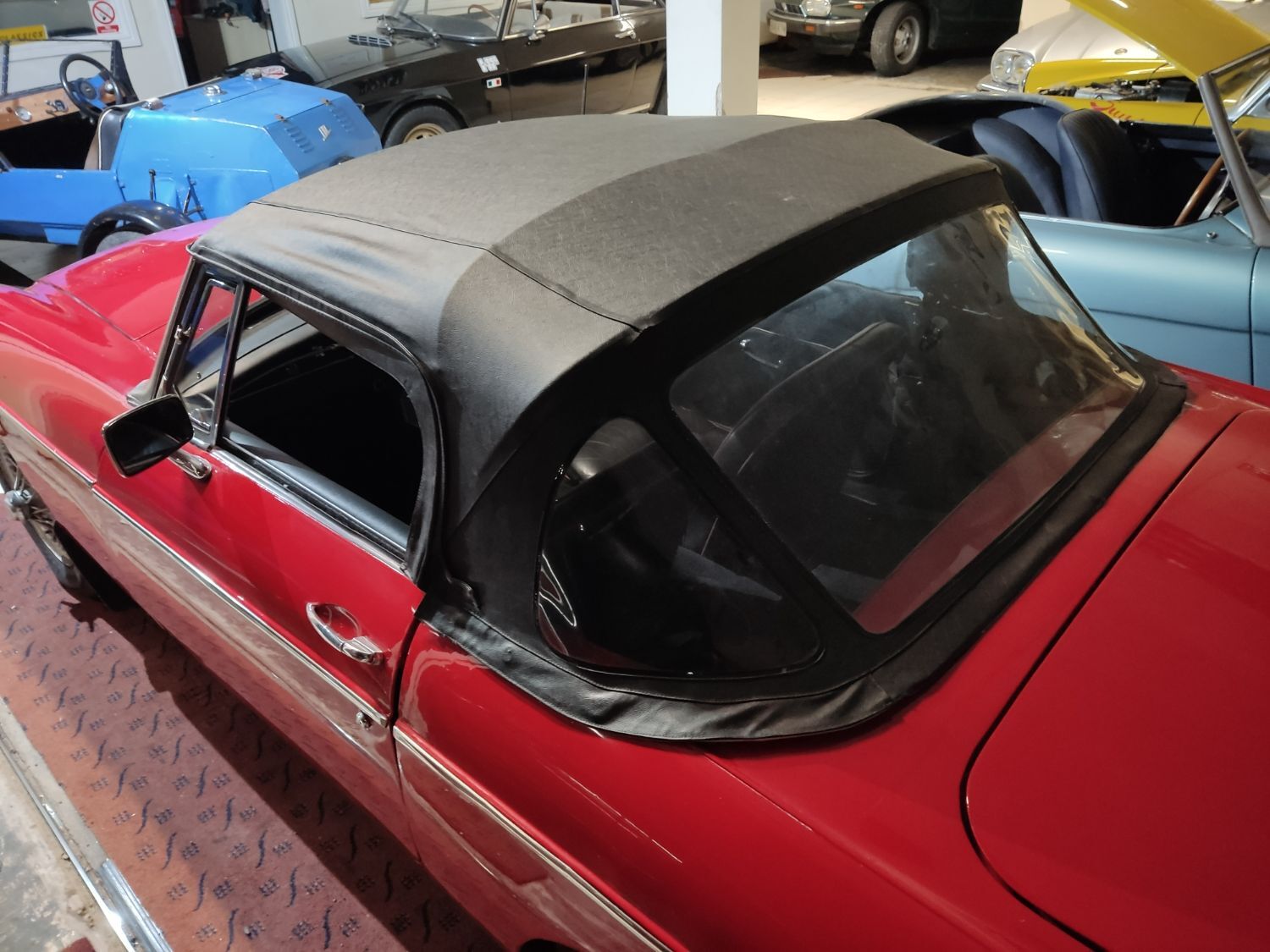 Body work is good and the paintwork still in nice condition and recently polished. All the shiny bits are shiny! The soft top appears to have had hardly any use and the black removable hard-top is in great shape and fits as it should. Inside is neatly trrimmed in black with red piping - all clean and tidy and free from rips or tears.