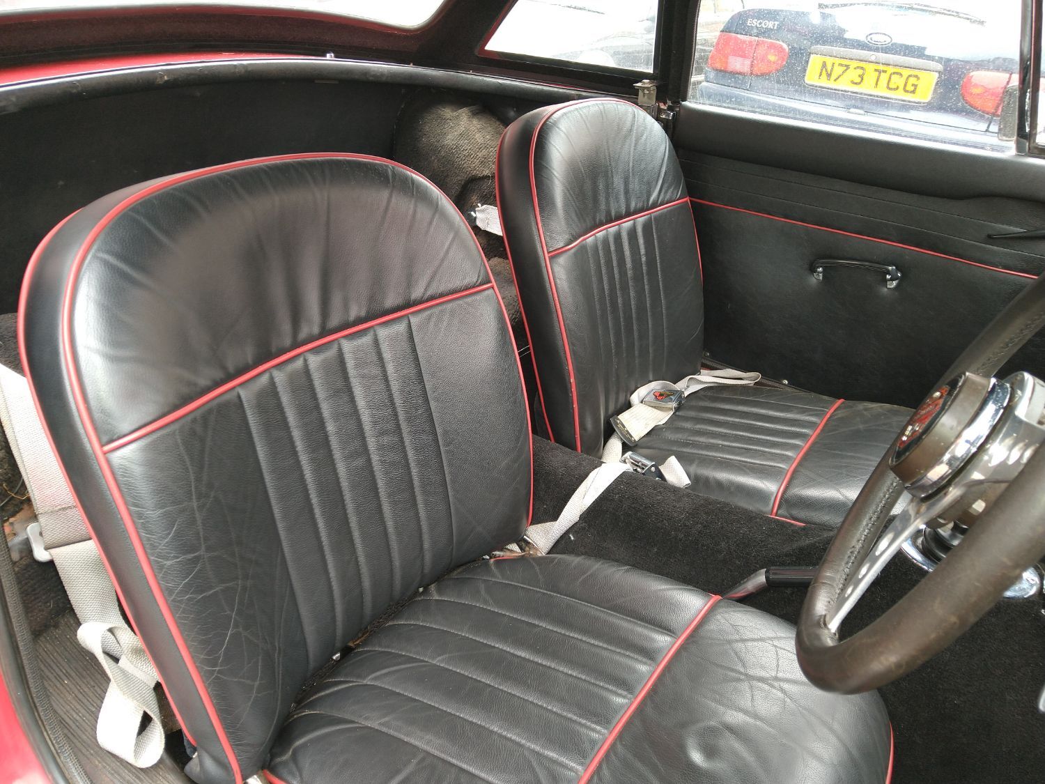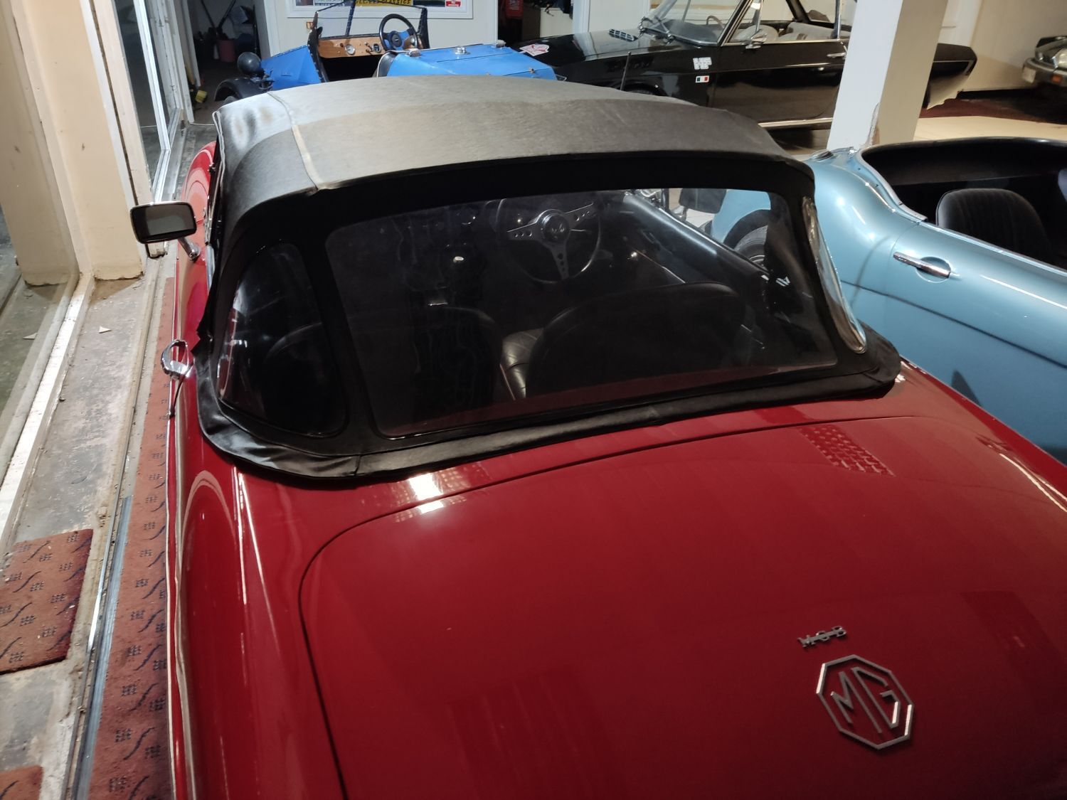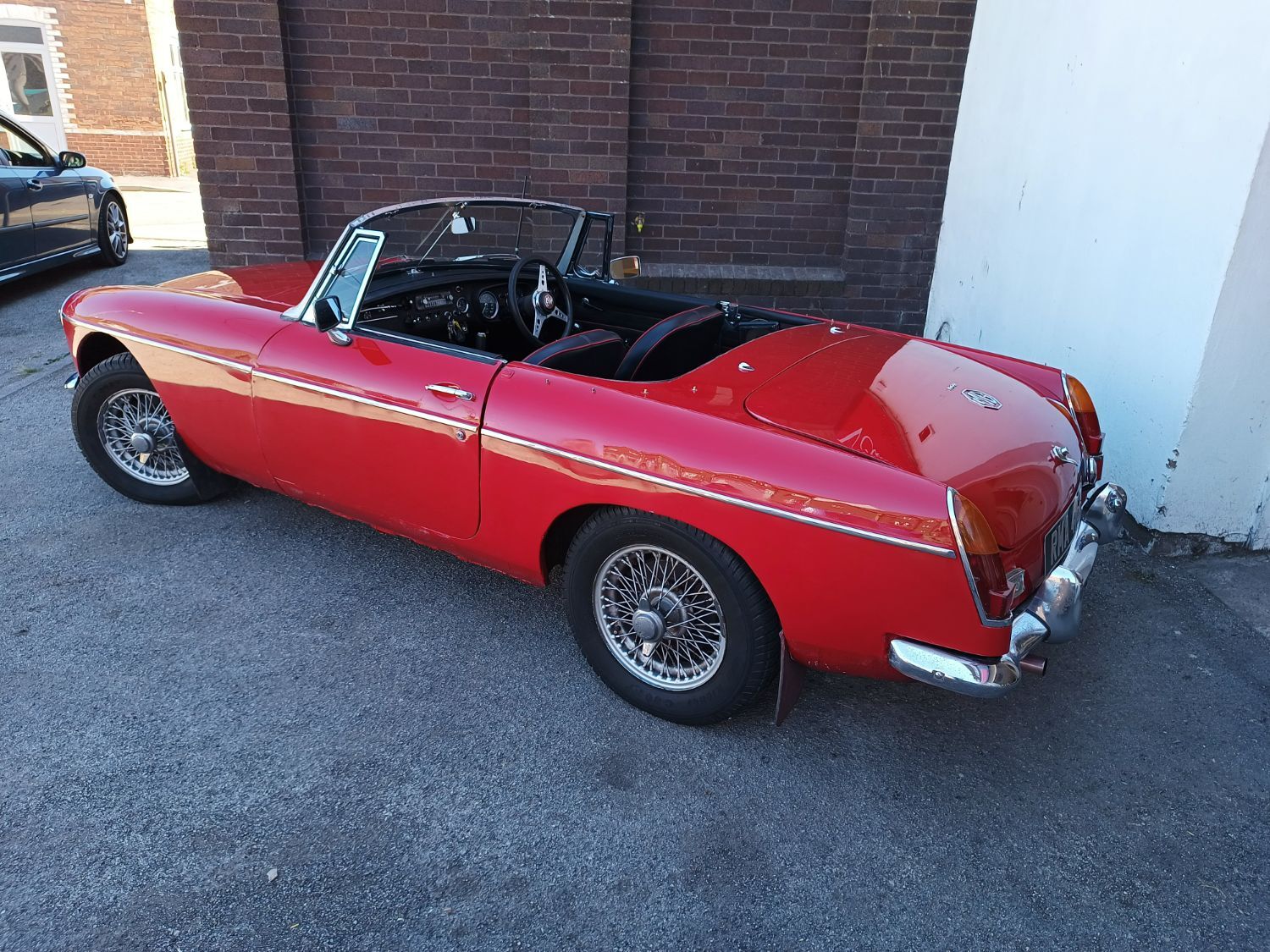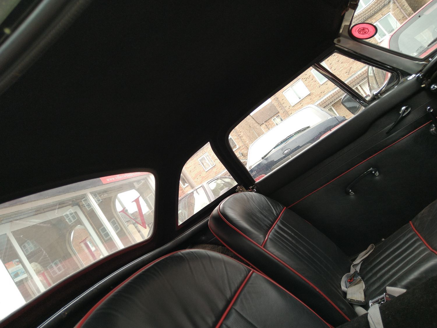 Body work is good and the paintwork still in nice condition and recently polished. All the shiny bits are shiny! The soft top appears to have had hardly any use and the black removable hard-top is in great shape and fits as it should. Inside is neatly trrimmed in black with red piping - all clean and tidy and free from rips or tears.