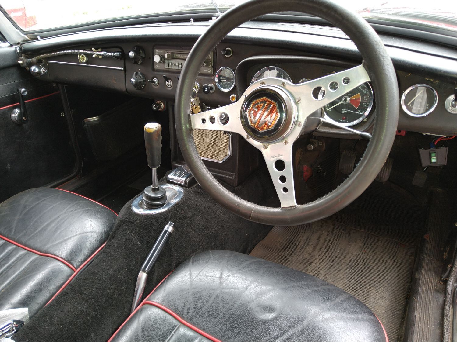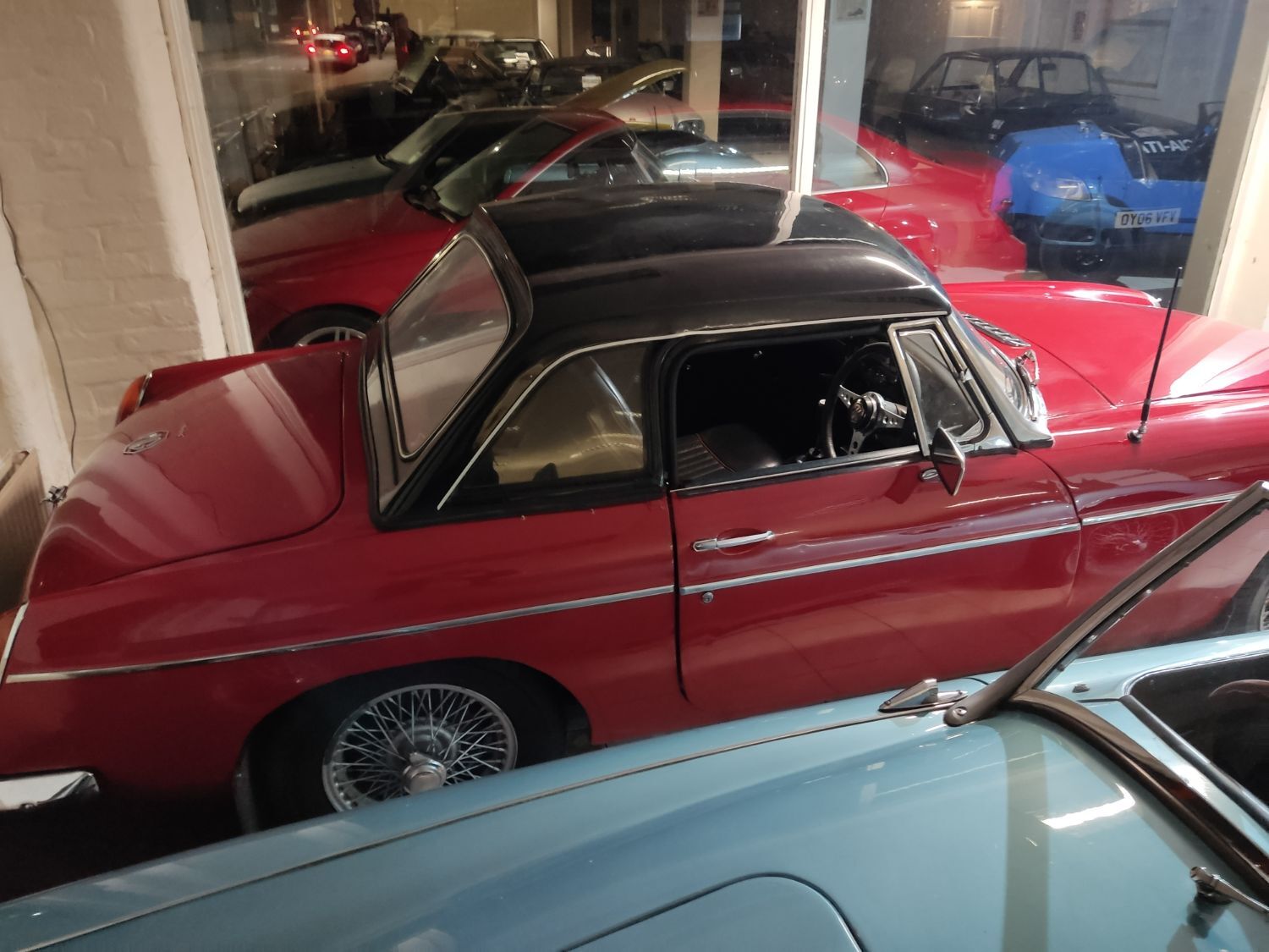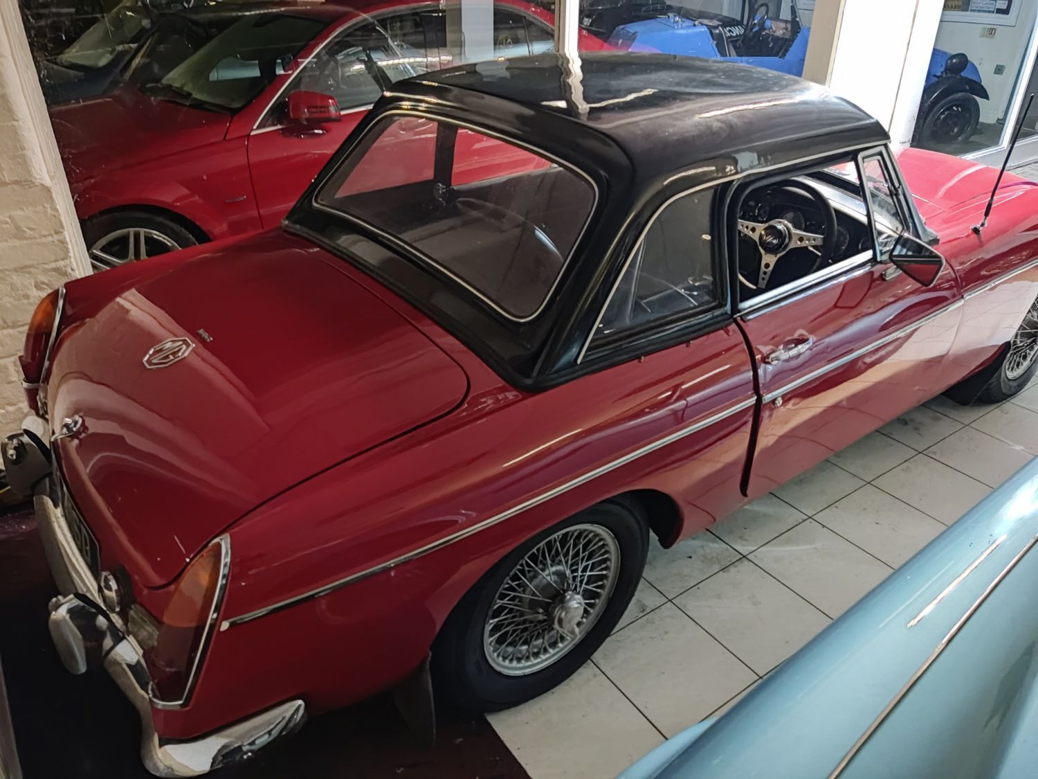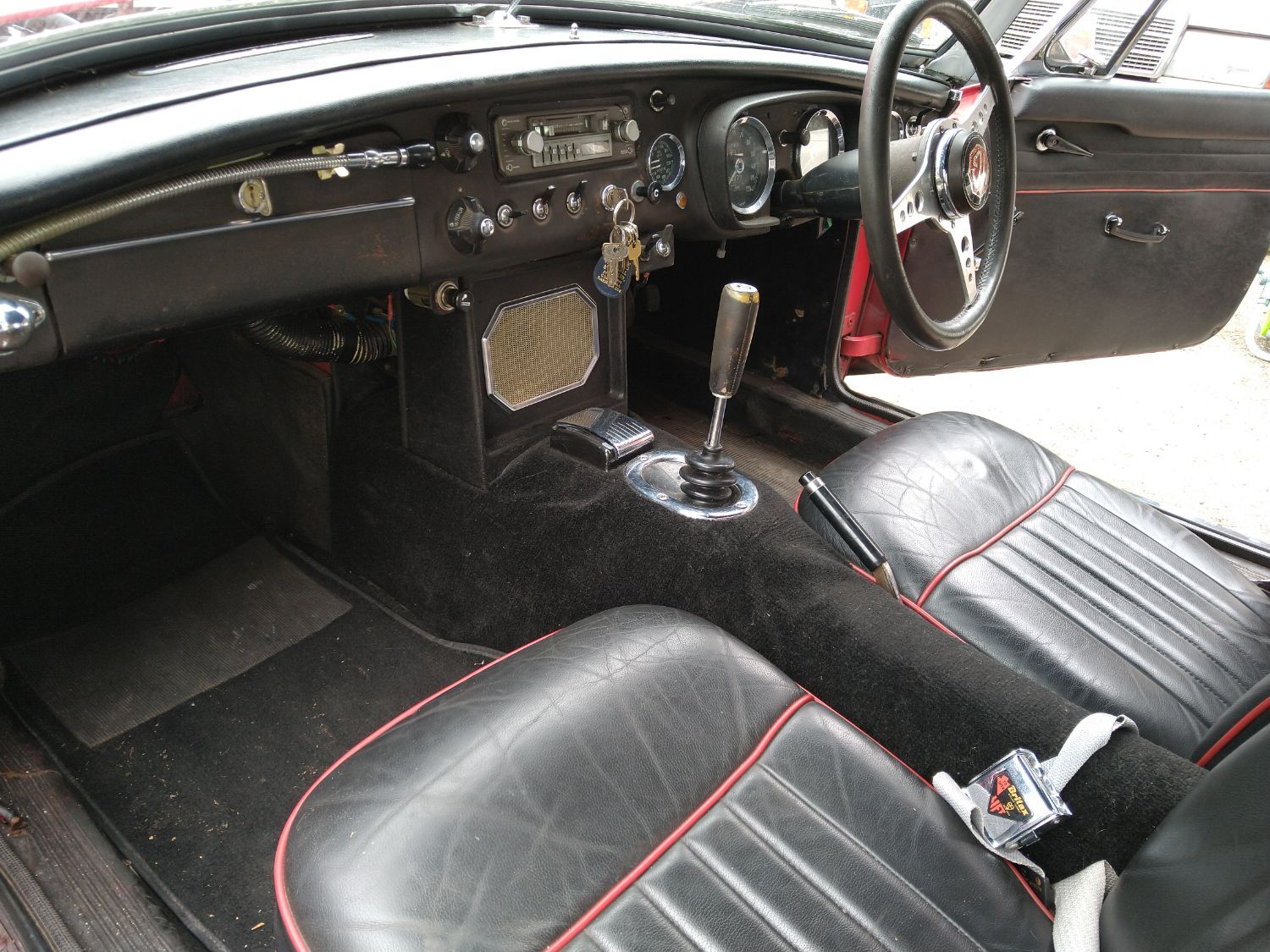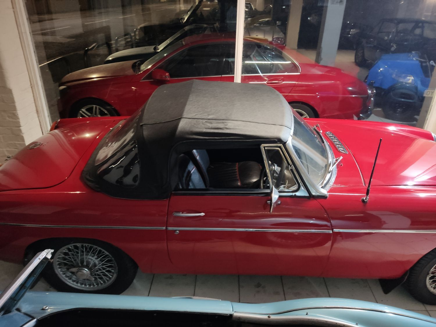 Body work is good and the paintwork still in nice condition and recently polished. All the shiny bits are shiny! The soft top appears to have had hardly any use and the black removable hard-top is in great shape and fits as it should. Inside is neatly trrimmed in black with red piping - all clean and tidy and free from rips or tears.